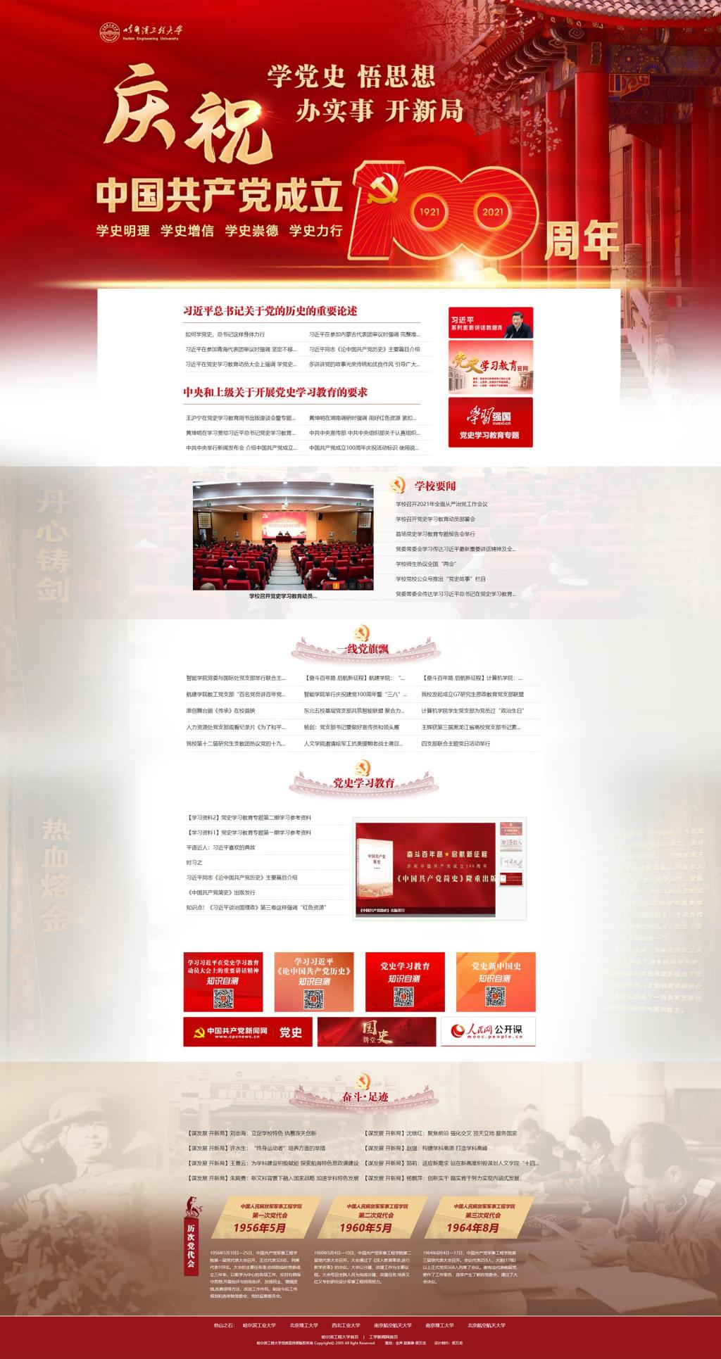 除此,该专题网站以学校68年光辉历程中12次党代会为线索,全景展示了学校哈军工——哈船院——哈工程三个历史时期的重大变化、重要决策,为全校师生提供“学史明理、学史增信、学史崇德、学史力行”的精神动力。