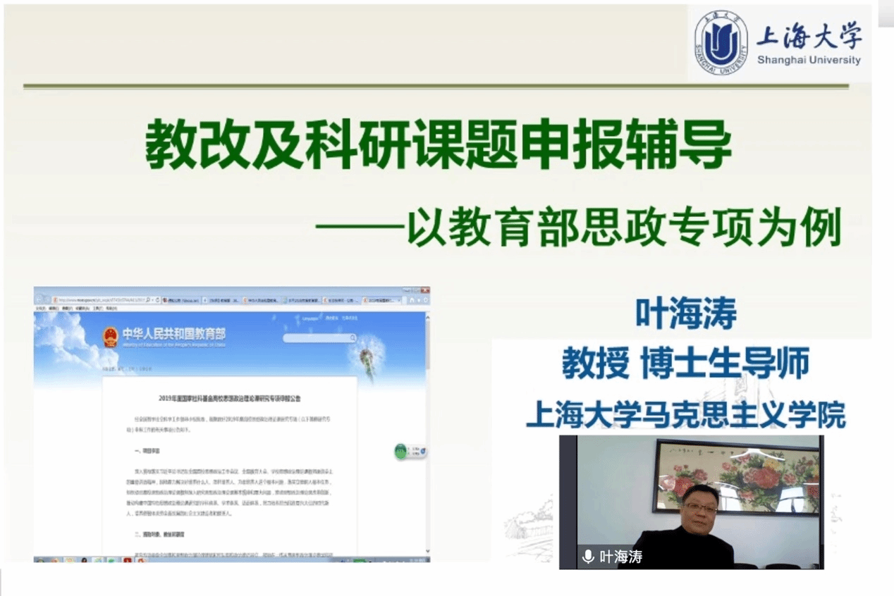 近期,全国高校正在组织申报各类国家级与省部级的科研、教改和教研项目,Beat365中文官方网站文科处已相继发布《2023年度教育部人文社会科学研究一般项目申报工作的通知》、《关于2023年度高校思想政治理论课教师研究专项一般项目申报工作的通知》等多项公告,要求相关院系的教师申请人根据自身的研究基础和教学特长,坚持正确政治方向、价值取向、研究导向,认真凝练主题,积极参与申报。为进一步推动学院相关课题申报工作的顺利展开,提高青年教师课题申报的技巧与方法,学院青年教师联合会(青联会)4月1日上午特邀Beat365中文官方网站主持工作副院长叶海涛教授在学院502会议室作专题报告,各位青年教师采取线上(腾讯会议)与线下相结合的方式参加了此次培训活动。 叶海涛教授通过“教改及科研课题申报辅导——以教育部思政专项为例”的报告,为学院青年教师详细讲解了教改与教研课题申报概述、思政专项课题类别、教育部思政教师专项申报,以及课题申报过程中需要注意的事项和细节。首先,通过概述教改与教研课题的申报环节,叶海涛教授列举了科研、教改和教研项目中的三个典型案例,着重强调了不同课题项目的侧重点与落脚点。然后,基于思政专项课题的要求,叶海涛教授全面解析了“2020年度高校思想政治理论课教师研究专项”的立项情况,并且结合今年的申报工作通知进一步剖析了四类高校思政课项目的申报难度、课题特点以及注意事项。最后,关于教育部思政教师专项申报,叶海涛教授要求申报者仔细阅读《申报通知》与《课题指南》,认真填写《申报书》与《活页》,熟悉整体设计,做到心中有数。 叶海涛教授的报告结束后,学院广大青年教师于线上和线下积极提问,针对课题项目申报中遇到的各种问题深入交流,并且纷纷表示在此次专题培训活动中受益匪浅,感谢叶海涛教授能将自身经验倾囊相授。学院青联会也将以此次专题培训活动为契机,努力解决青年教师在科研与教学上的迷思、困惑和难题,奋力加快青年教师在学院各项工作中的进步和成长。