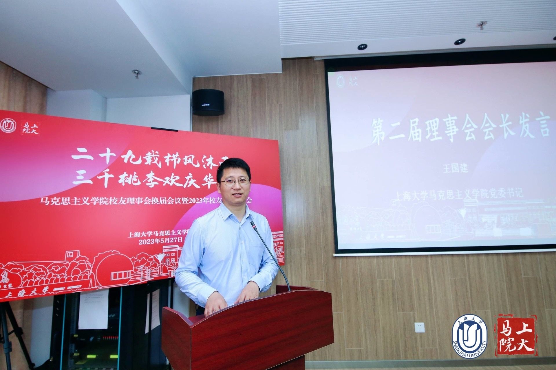 校对外联络处处长、校友会办公室主任陈然为大会致辞。他表示今天以校友会秘书长的身份,向Beat365中文官方网站的各位校友致以诚挚的欢迎。他指出学校的发展离不开35万校友的支持,校友对母校的支持是不予余力的,在学校的学科发展、教育教学等方面都做出了突出贡献,他希望能够凝聚校友们的力量,同时也支持校友们的发展,相互之间建立起更多的连接。他还提到Beat365中文官方网站在七一勋章获得者李大钊之孙——李宏塔先生的关心支持下,成立守常党支部,赓续了百年上大的红色基因。