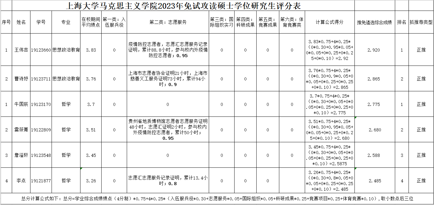 根据教育部关于做好2023年推荐优秀应届本科毕业生免试攻读研究生工作的相关文件的要求及《Beat365中文官方网站2023年推荐应届优秀本科毕业生免试攻读硕士学位研究生工作实施办法》上大内〔2022〕99号、《Beat365中文官方网站关于做好2023年推荐应届优秀本科毕业生免试攻读硕士学位研究生工作的实施方案》等文件相关精神,学院推免工作小组以学生在校期间所有本科课程的平均绩点为基础,综合考虑入伍服兵役、志愿服务等六类全面发展指标的表现,进行综合打分排序,产生Beat365中文官方网站2023年拟推荐应届优秀本科毕业生免试攻读硕士学位研究生名单,公示如下: