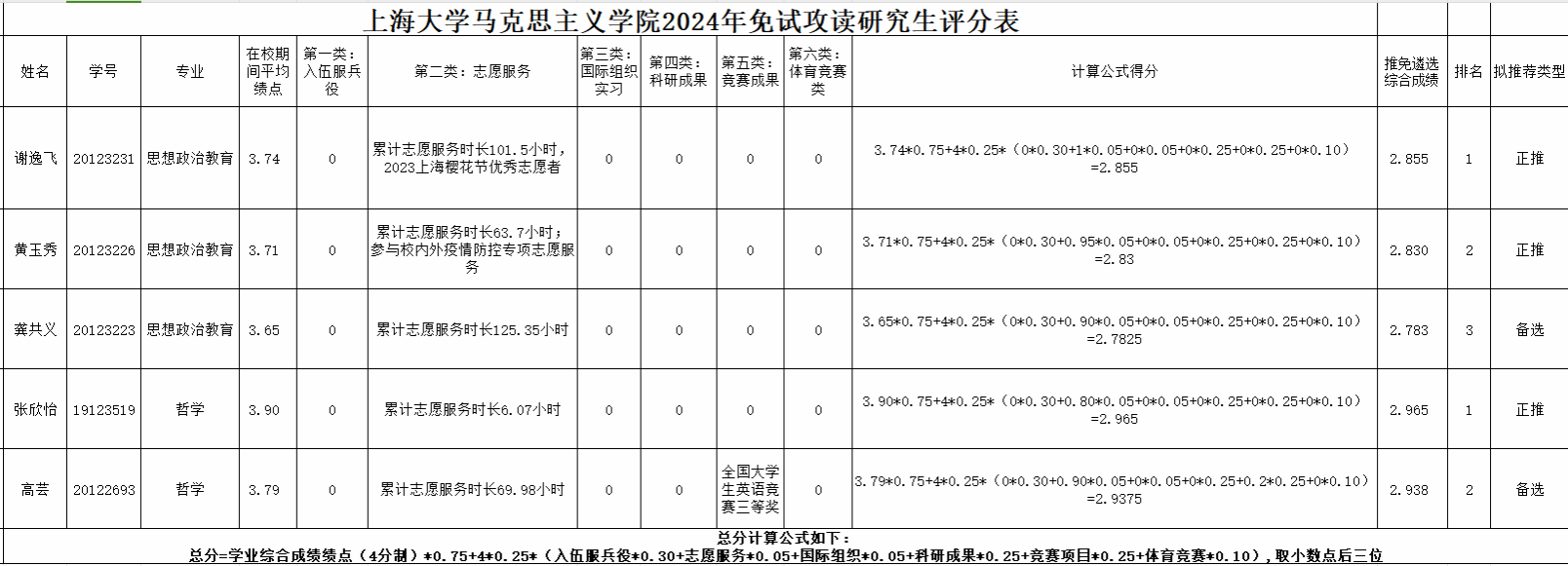 根据教育部关于做好2024年推荐优秀应届本科毕业生免试攻读研究生工作的相关文件的要求及《Beat365中文官方网站2024年推荐优秀应届本科毕业生免试攻读研究生工作实施办法》、《Beat365中文官方网站2024年推荐优秀应届本科毕业生免试攻读研究生工作实施方案》等文件相关精神,学院推免工作小组以学业综合成绩即学生本科阶段截至2022-2023学年夏季学期结束,学生所修读的所有本科课程的平均成绩绩点(以学生成绩大表为准),综合考虑入伍服兵役、志愿服务、国际组织实习、科研成果、竞赛成果、体育竞赛成果等六类全面发展指标的表现,进行遴选综合成绩排序,产生Beat365中文官方网站2024年拟推荐应届优秀本科毕业生免试攻读研究生名单,公示如下: