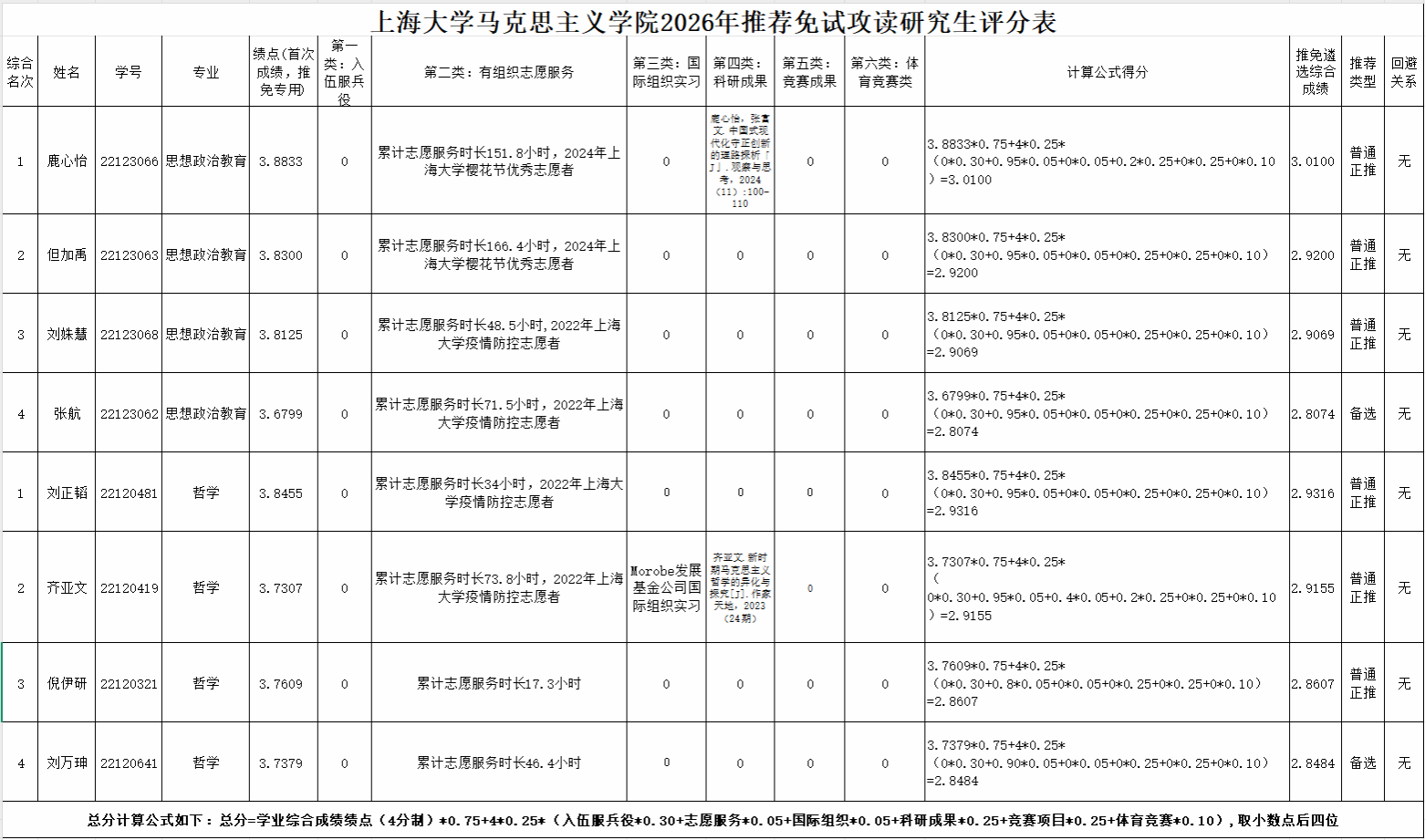 根据《Beat365中文官方网站2026年推荐优秀应届本科毕业生免试攻读研究生工作实施办法》(上大内【2025】151号)、《Beat365中文官方网站2026年推荐优秀应届本科毕业生免试攻读研究生工作实施方案》等文件相关精神,通过学生本人申请,综合考虑入伍服兵役、有组织志愿服务、国际组织实习、科研成果、竞赛成果、体育竞赛成果等六类全面发展指标的表现,经学术专长推免专家审核小组材料核实和学院推免工作领导小组审议,现将Beat365中文官方网站2026年拟推荐应届优秀本科毕业生免试攻读研究生名单,公示如下: