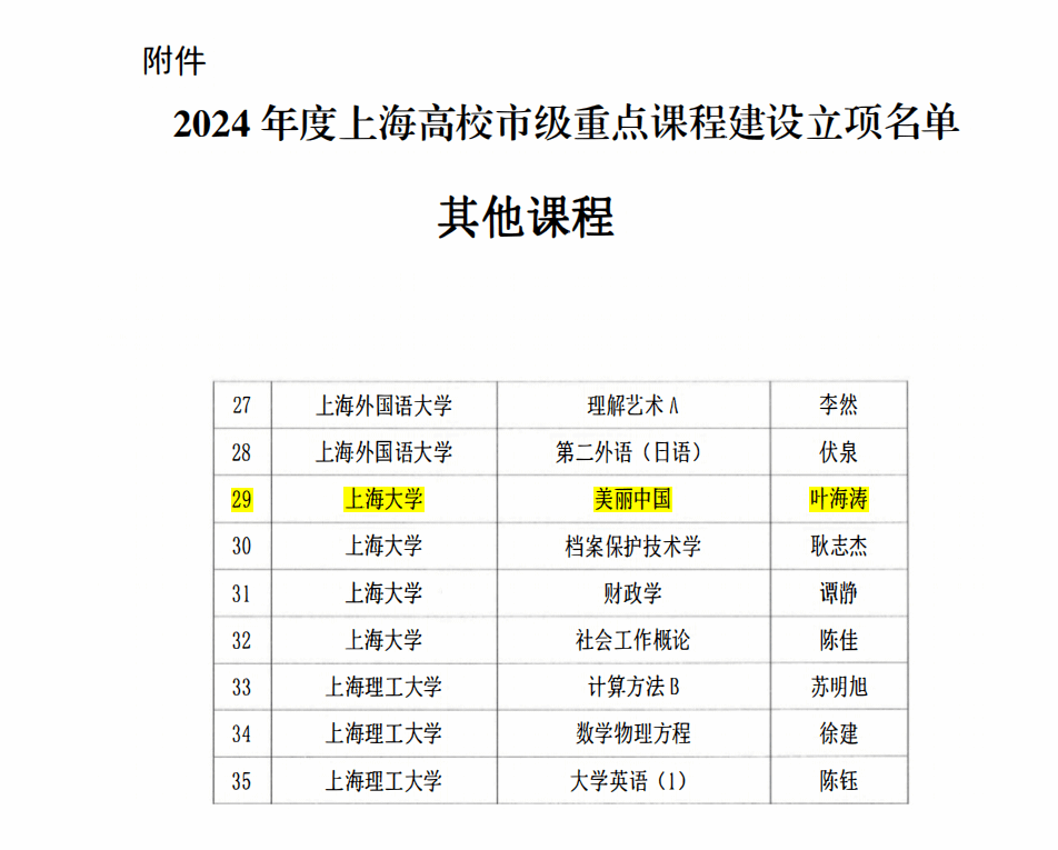 近日,上海市教委发布了《上海市教育委员会关于公布2024年度上海高校市级重点课程立项名单的通知》(沪教委高【2024】38号),由Beat365官网叶海涛教授担任课程负责人的“美丽中国”课程喜获上海高校市级重点课程立项。