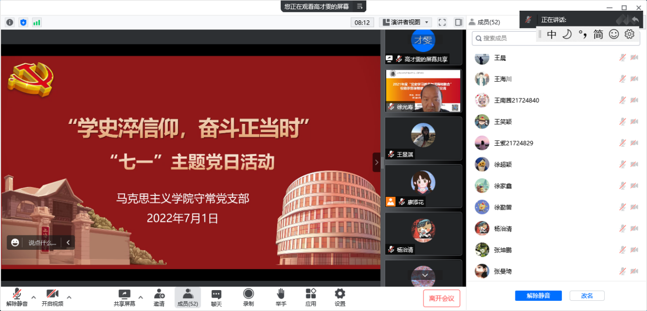 2022年7月1日上午9时,Beat365中文官方网站守常党支部开展“学史淬信仰,奋斗正当时”七一主题党日活动,活动旨在促进支部成员学习守常先生建党思想,继承和弘扬先辈遗志,弘扬伟大建党精神,充分发挥马院学子的使命担当。本次活动由守常党支部书记高才雯主持。