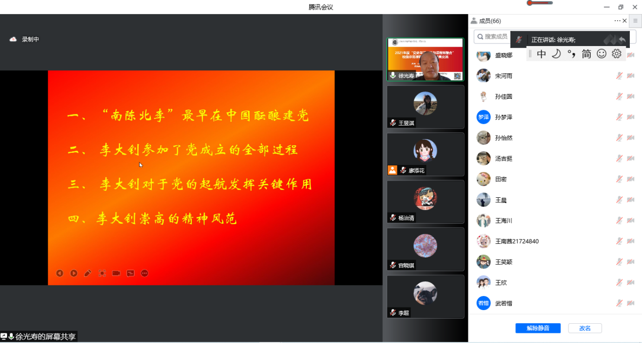 此外,徐光寿教授就学术研究与论文写作方面对同学们提了四点指导建议:一是要坚持文献研究法与比较研究法相结合,要全面使用资料、使用一手资料、梳理筛选资料,并基于资料进行充分、全面的比较研究;二是要遵循论证的路径,利用现有资料,有逻辑地论证观点,得出结论;三是要加强论文摘要的写作练习,学会在摘要中清晰地展现论文的观点与创新性;四是要坚持党性与科学性的统一,强调党性是灵魂,科学性是根本。勉励马院学子要继承好上大的优良学风,在导师的指导下做好研究,提高研究水平,开阔研究视野,掌握科学研究方法。 讲座结束后,守常党支部成员王笑颖、赵慧敏、彭思敏就此次主题党日活动发表感言。 王笑颖认为,在此次讲座中,自己不仅对李大钊在建党过程中的贡献有了更清晰的认识,对“守常精神”有了更深刻的感悟,还进一步了解到作为研究生应该掌握的学术研究方法。她表示深受启发,决心“以后专注于历史文献的阅读,丰富自身的知识体系”。 赵慧敏亦从自身党史党建专业方向出发,就“政党”一词发表了自己的见解,她认为在新时代的今天,我们作为马理论专业的研究生,在建党101周年的历史之际,更要深入学习和感悟伟大建党精神,将所学知识应用到学理性实践中。 彭思敏借此机会,就“党的初心”和“李大钊先生的初心”两者之间的关系,以及党员同志如何坚守初心两个问题向徐光寿教授进行了求教。对此,徐光寿教授回答道:“伟大建党精神产生于中国共产党的创建过程中,而中国共产党的创始人则是伟大建党精神的贡献者和践行者。李大钊作为党的主要创始人之一,亦是‘党的初心’的贡献者、践行者与坚定者。”关于党员同志如何守初心的问题,徐光寿教授指出,首先要坚持学习党史,充实党史知识背景,了解“初心”是什么;其次要在实践中践行、落实“初心”,坚持从“学”到“行”,“学”“行”结合。