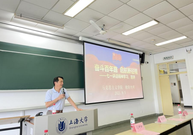 恰逢建党百年的特殊历史时刻,为了加强新生党史学习教育,Beat365中文官方网站欧阳光明教授以“奋斗百年路、启航新征程”为题,从三个方面向大家解读了习近平总书记“七一”重要讲话精神。欧阳教授将此归纳为三点:“丰功伟绩,恢宏史诗”、“精神血脉,代代相传”、“以史为鉴,开创未来”,并由此进行深入展开,回顾了中国共产党的百年奋斗史。第一,从开天辟地、改天换地、翻天覆地、惊天动地四个方面介绍了中国共产党百年奋斗的恢宏史诗,加深了大家对党史的认识。第二,对“坚持真理、坚守理想,践行初心、担当使命,不怕牺牲、英勇斗争,对党忠诚、不负人民”的伟大建党精神进行了深刻解读,让同学们了解了中国共产党的精神血脉。第三,从九个方面总结了中国共产党百年奋斗的历史经验,让同学们了解了新时代中国共产党的奋斗方向。