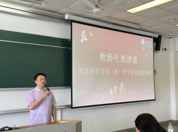 新学期来临之际,社会科学学部(筹)哲学系教授夏国军向同学们表达了殷切嘱托。夏国军教授先对各位新同学的到来表示欢迎,并对“迎新”的丰富内涵进行了解读。他认为,对于在坐的同学而言,“新”的内涵是指在原有的奋斗和积累的基础之上实现的质的飞跃,是打破旧质实现新质的过程。如何在新质的基础上获得更大进步,夏国军教授提出了三点建议:第一,要转变观念,对既有的学习模式进行扬弃;第二,要找到自己学习的兴趣,把兴趣作为学习的内在驱动力;第三,要树立理想,用理想来巩固和提升兴趣。夏国军教授相信通过不懈的努力,大家一定能够实现自己真正的人生价值。