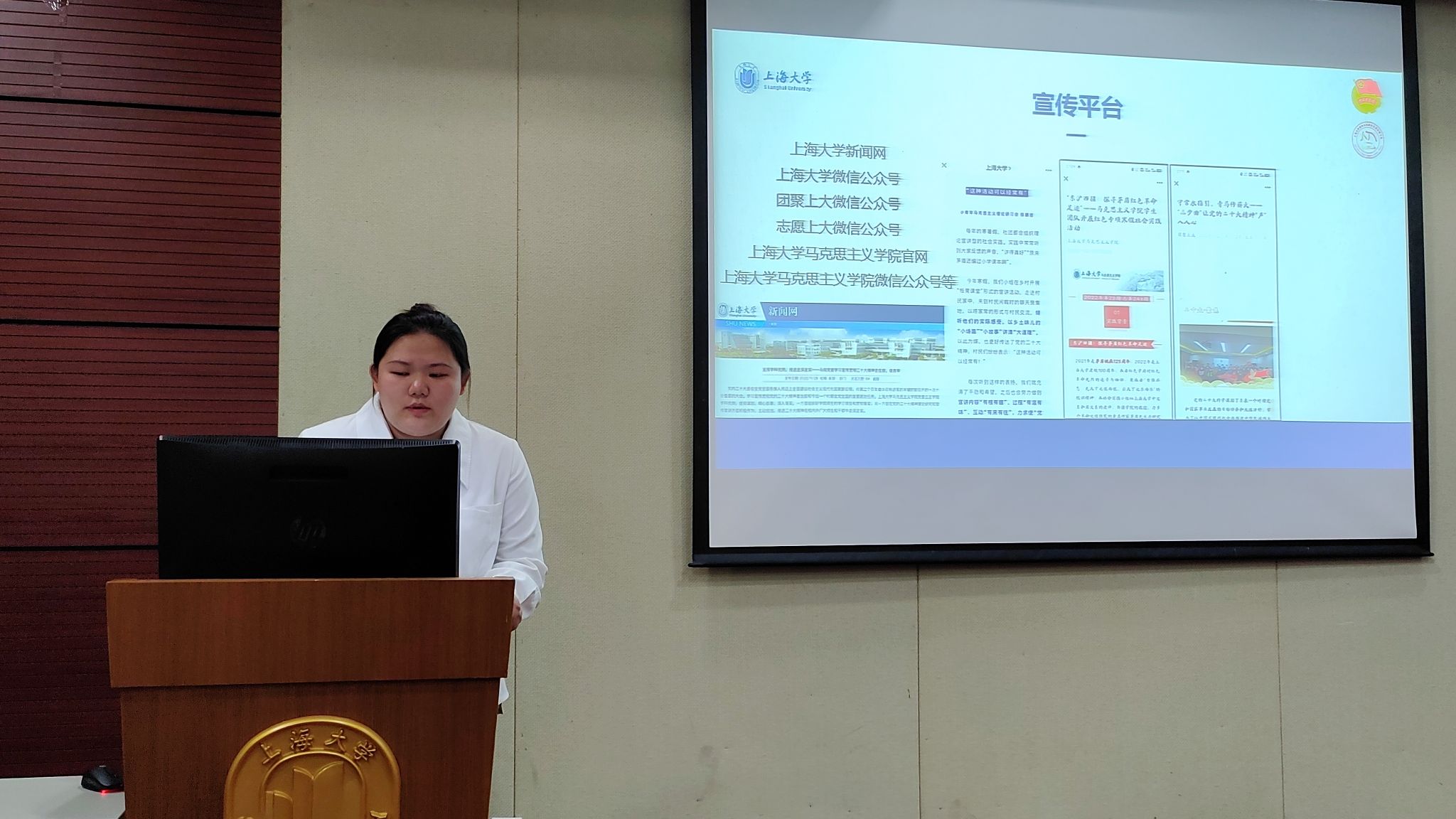 第六届青马研习会主席团成员陈鹏吉从“社团建设”、“社团活动”、“荣誉”等方面对2022~2023年青马研习会的工作进行了全面总结。陈鹏吉先是带领大家回顾了社团的理念、宗旨、定位、架构、标识等社团基础信息,随后她依次介绍了青马研习会在过去一年内所组织举办的各项活动,从“党的二十大精神宣讲团”的成立及校内外宣讲,到赴湖州市安吉余村、德清五四村等红色调研,以及真理的力量——纪念马克思诞辰200周年主题展等,作为“2022年度上海高校活力社团”与“2022年度Beat365中文官方网站优秀社团”,她坚信,青马研习会将始终以“踔厉奋发、挺膺担当”的良好精神风貌大步前行。