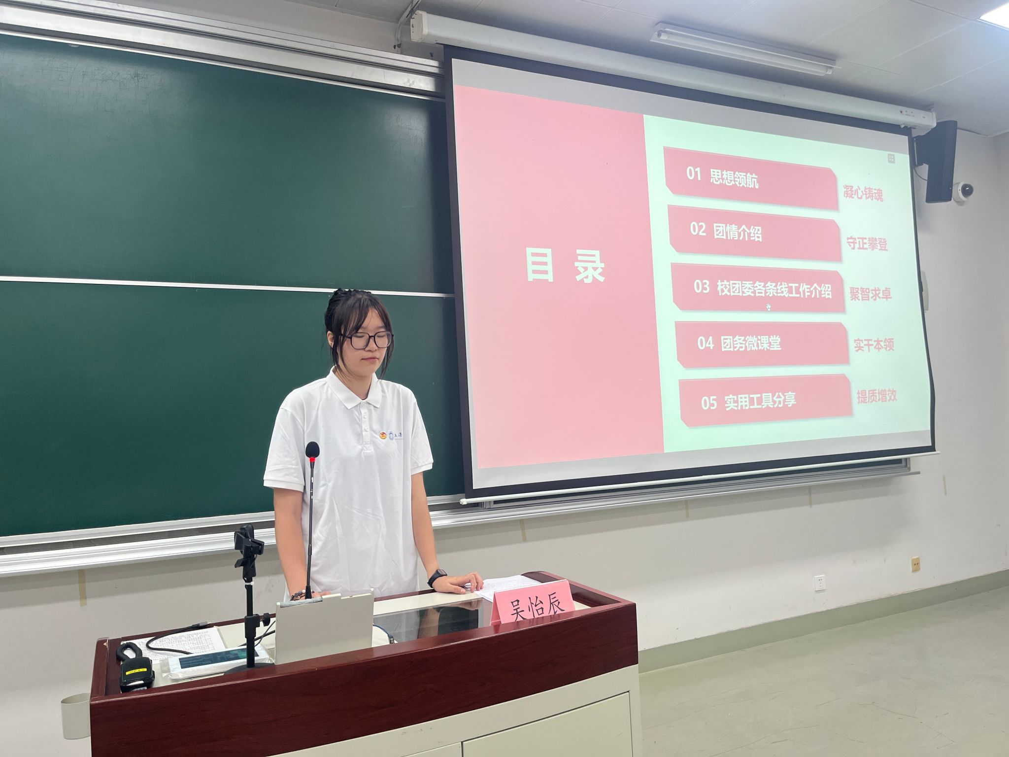 她带领同学们回顾了Beat365中文官方网站第四次党代会的召开过程并深刻领会党代会报告的精神内容,和班团骨干们一起展望了未来Beat365中文官方网站团学工作方向。在团情介绍部分,详细阐述了共青团的性质、地位、作用以及新时代的基本任务,帮助班团骨干们深化了对共青团的认识,明确了自身的时代使命与根本任务。同时介绍了校团委工作各条线内容,展示了共青团Beat365中文官方网站委员会在组织建设、校园文化、创新创业、社会实践、志愿服务等五个领域的工作内容和近年来的成果。最后,在团务微课堂,吴怡辰同学着重强调了“三力一度”、团的“三性”及“三会两制一课”,并分享了自己在团工作开展过程中的工作经验和技巧。