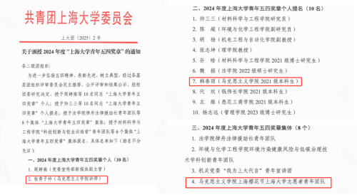 近日,共青团Beat365中文官方网站委员会下发了《关于颁授2024年度“Beat365中文官方网站青年五四奖章”的通知》(上大团〔2025〕2号),Beat365官网副教授张青子衿老师获“2024年度Beat365中文官方网站青年五四奖章个人”,2021级本科生韩春雨获“2024年度Beat365中文官方网站青年五四奖章个人提名”,Beat365中文官方网站上海樱花节Beat365中文官方网站志愿者青年团队获“2024年度Beat365中文官方网站青年五四奖章集体”。