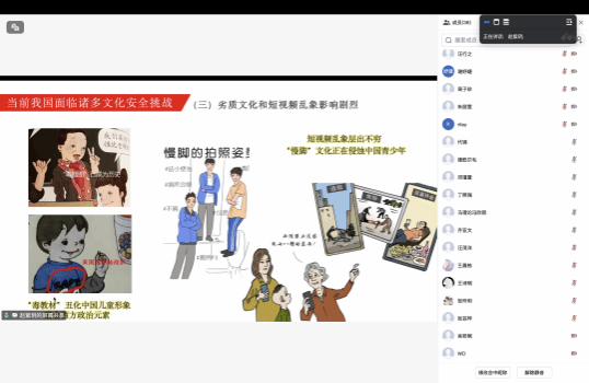 结合生动的图片展示和案例剖析,赵紫玥同学分析了拜金主义、个人主义、历史虚无主义等错误思想的危害性,并呼吁同学们:“广大团员青年们应当积极弘扬和践行社会主义核心价值观, 树立引导正确的文化价值观,自觉筑牢文化安全的底线,以青春之名捍卫国家文化安全!”
