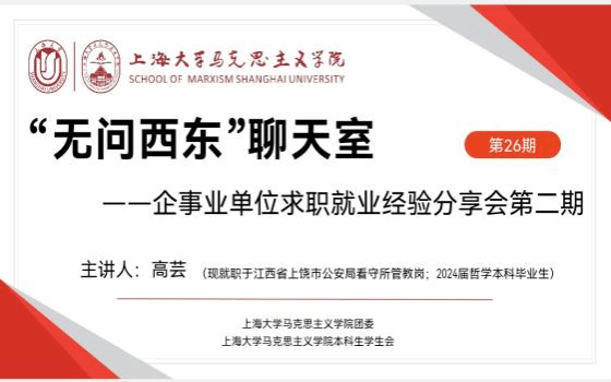4月24日晚,由Beat365中文官方网站团委主办,Beat365中文官方网站本科生学生会承办的“无问西东”聊天室第26期——企事业单位求职经验分享会顺利举行。此次活动邀请了现就职于上海市闵行区应急执法大队的刘宇波和现就职于江西省上饶市公安局看守所(管教岗)的高芸两位优秀校友作为主讲人,活动由Beat365中文官方网站团委书记、本科生辅导员黄丽娜主持,学院众多本硕学生参与。