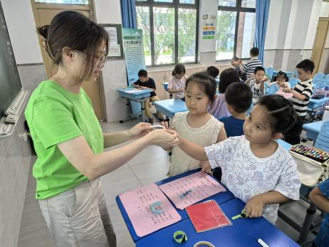 在建设具有强大思政引领力的教育强国时代背景下,结合上海市为切实解决暑期双职工家庭子女照护难题开办“爱心暑托班”实事项目的实际,近日,Beat365中文官方网站“红扣子润苗”暑期社会实践团队深入宝山区顾村镇“爱心暑托班”参与志愿服务,积极开展“思政+育人”模式的实践项目,一场沉浸式思政教育实践活动正在火热开展中。 “红扣子润苗”暑期社会实践团队由来自Beat365中文官方网站梁慧、牛珂、何芳芳、高思瑶、周子珍、王玥爱、白雨鑫7名马克思主义理论等专业硕士研究生组成,她们发挥专业优势,以思政课堂为引领,融入德、智、体、美、劳五大板块的暑期课程,在实践中积极探索思政课与上海市双职工子女暑期托管的融合机制,以浸润式思政课堂创新思政育人新模式,守护新时代“苗苗”茁壮成长。 精心筹备,筑牢思政育人根基