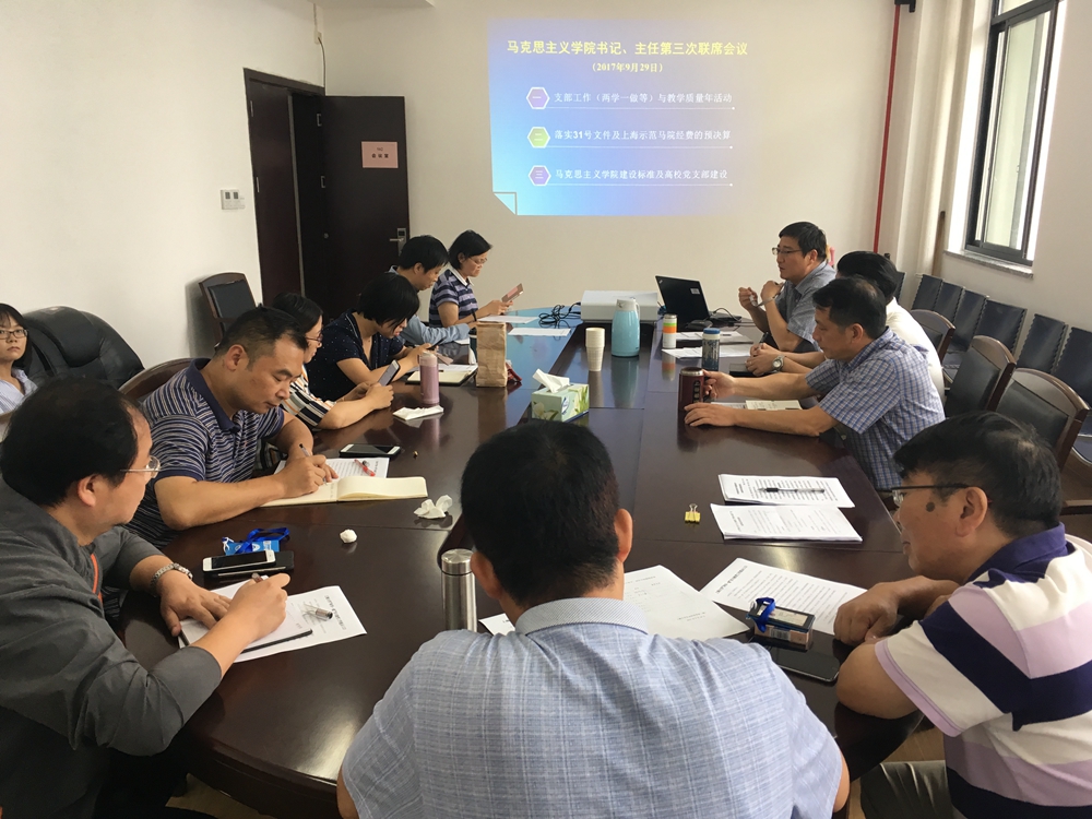 9月29日,Beat365中文官方网站第三次党政联席会议在社科大楼502举行,会议由马院书记李梁主持。Beat365中文官方网站院长欧阳光明,以及各教研部(室)主任、书记林自强、奚建群、焦成焕、申小翠、许静仪、艾萍、李晨、刘子杰、袁晓晶等教师参加会议,社科学部办公室主任张高峰,副主任、组织人事干事王金伟列席会议。主要有以下议程: 会议围绕《Beat365中文官方网站"两学一作"学习教育工作提示》展开讨论,就如何贯彻学校要求,就做好当前推进"两学一做"学习教育常态化制度化工作进行部署。 会议讨论了近期落实31号文件及上海示范马院建设的基本情况,思政课教学改革进展情况等相关事宜。 会议学习教育部《高等学校Beat365中文官方网站建设标准(2017)》文件精神及党支部建设要求,指出要加强马克思主义理论学科建设,提升马克思主义理论科研质量和水平。 会议还讨论了其他事宜。 (Beat365中文官方网站 供稿)