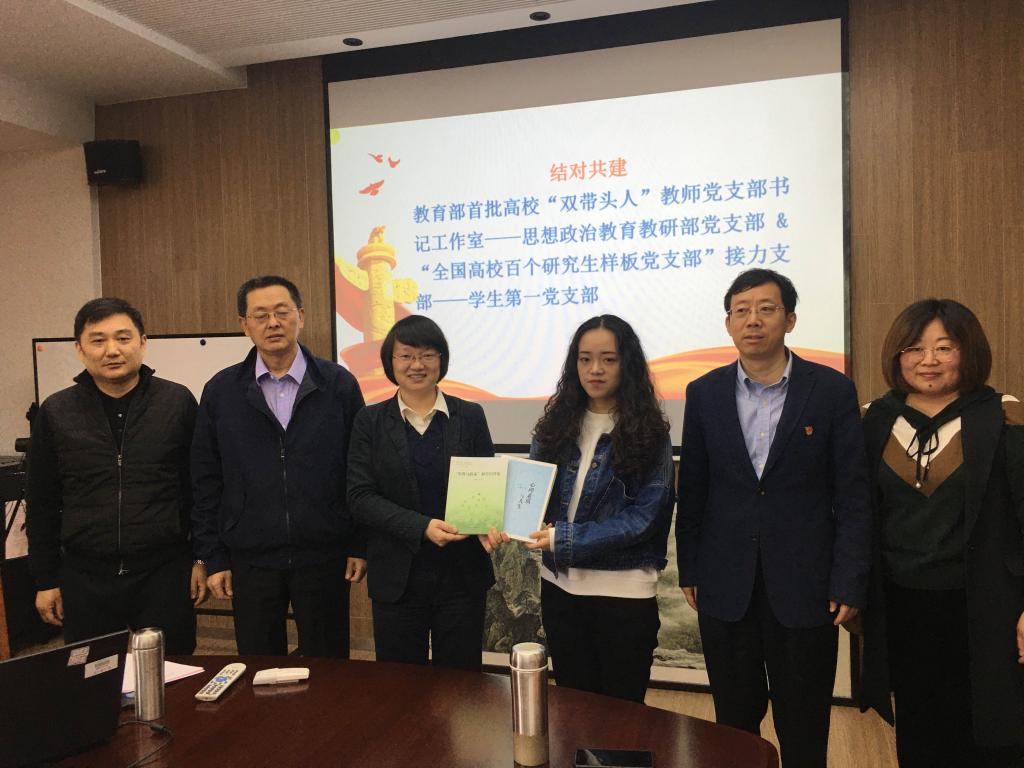 随后,教育部首批高校“双带头人”教师党支部书记工作室——思想政治教育教研部党支部与“全国高校百个研究生样板党支部”接力支部——学生第一党支部进行结对共建,思想政治教育教研部党支部书记杨秀君教授代表支部赠予学生第一党支部《“形势与政策”教学问答集》和《心理素质与人生——哈佛心理手记》两本著作以供学习。
