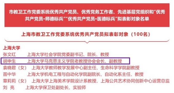 今年是中国共产党成立100周年,也是“十四五”规划开局起步之年。为进一步激励系统各级党组织和广大党员奋勇争先、冲锋在前,在全面推进上海教育和卫生健康事业深化改革发展中积极进取、建功立业,市教卫工作党委决定,在系统范围内表彰一批优秀共产党员、优秀党务工作者、先进基层党组织和“优秀共产党员·师德标兵”“优秀共产党员·医德标兵”。其中,Beat365官网退休老教授胡申生荣获“优秀共产党员”称号。
