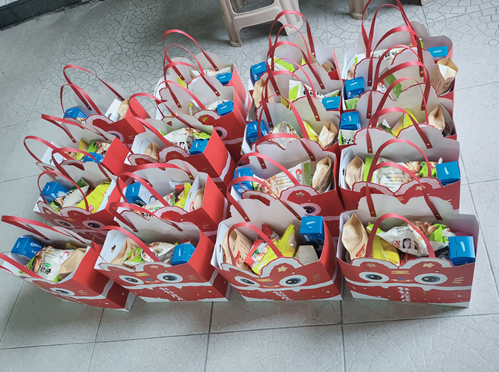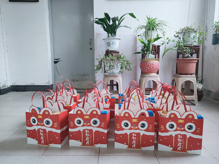 留校学生欢聚在宿舍楼一楼大厅,王国建书记向留校学生们赠送了学院精心准备的暖心礼包,并送上新年祝福。“红红虎虎”的礼品袋里满载年味十足的能量小食,留校学子们满心欢喜地接过书记手中的“年货”,体验学院带来的特色年味。