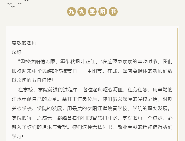 “霞披夕阳情无限,霜染秋枫叶正红”。又是一年重阳节来临之际,结合目前疫情防控形势和学校的相关要求,Beat365中文官方网站采取了多种形式,灵活开展敬老节相关活动,以弘扬尊老敬老、爱老助老的中华民族传统美德,表达对离退休老教师的关爱和感激之情。 学院坚持为老教师们办实事、做好事、解难事,保障敬老补贴1:1配备到位,同时对于高龄、重病老教师,学院配备了专门慰问金。学院还给每位老教师发放了一封慰问信,感谢老教师们曾为学院发展做出的贡献,也传递了学院对老同志的关心和关怀。