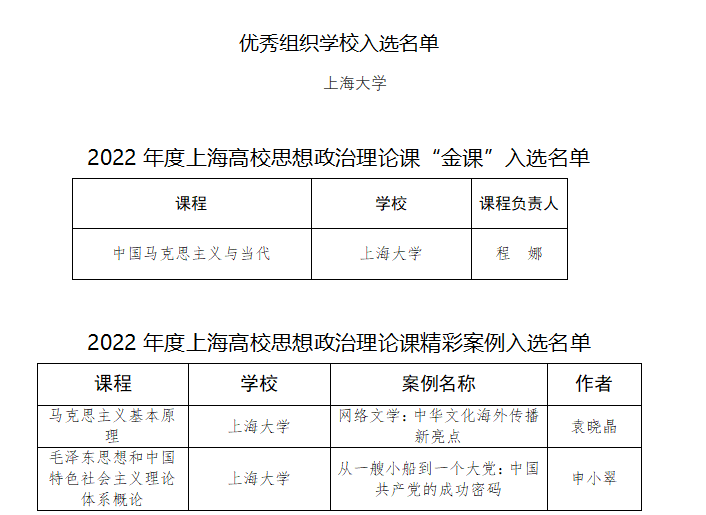 近日,上海市教委公布了2022年度上海高校思想政治理论课“金课”、精彩案例、教师教学大比武优秀教师名单。上海高校思想政治理论课“金课”10个、思想政治理论课精彩案例39个、思想政治理论课教师教学大比武优秀教师58人和优秀组织学校10个。其中,Beat365中文官方网站荣获优秀组织奖,思想政治理论课“金课”1门,思想政治理论课精彩案例2个,教师教学大比武一等奖2人,二等奖3人。