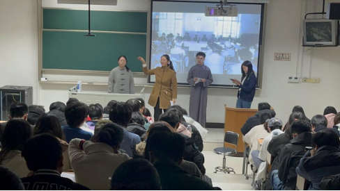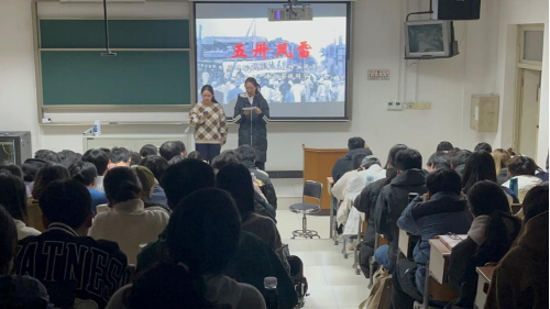 2024年1月10日晚,伴随雄壮的《国际歌》旋律——“起来,饥寒交迫的奴隶。起来,全世界受苦的人,满腔的热血已经沸腾,要为真理而斗争,旧世界打个落花流水。……这是最后的斗争,团结起来到明天,英特纳雄耐尔就一定要实现”在嘉定校区1教433教室思政课堂响起,“沉浸式思政课”2.0版——“五卅风雷”沉浸课展演顺利举行。