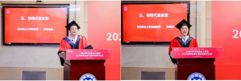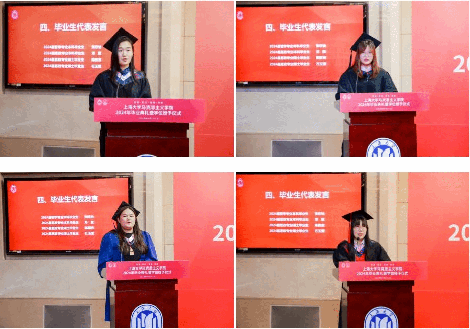 毕业生代表哲学专业本科毕业生张欣怡、思政专业本科毕业生邓童、思政专业硕士毕业生陈鹏吉以及思政专业博士毕业生石玉莹依次分享了他们在上大马院的成长与收获,感谢了母校母院的栽培,倾诉了恩师同窗的情谊,更宣誓了即将远行奔赴的梦想。