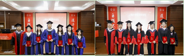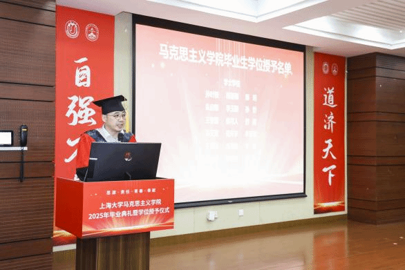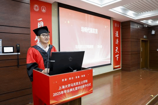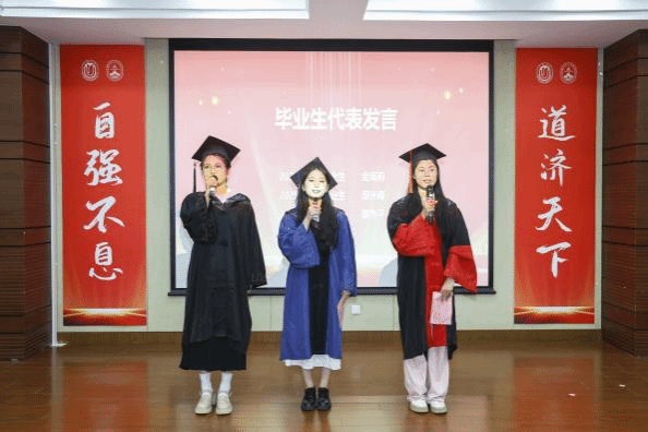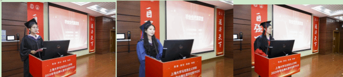 金海莉、周孙卿、魏艳平分别作为本科、硕士、博士毕业生代表依次上台发言。她们回顾自己在上大校园的成长经历,分享在学术探索旅途中的收获与感悟,同时也表达了对母校母院、师长和同学的感激和依依惜别之情。发言最后,三人齐诵李大钊先生的名言“以青春之我,创建青春之家庭,青春之国家,青春之民族,青春之人类,青春之地球,青春之宇宙,资以乐其无涯之生。”呼吁毕业生学子们铭记母校教诲,将青春融入时代征程,在实现中华民族伟大复兴的道路上奋勇当先,书写属于自己的精彩篇章。