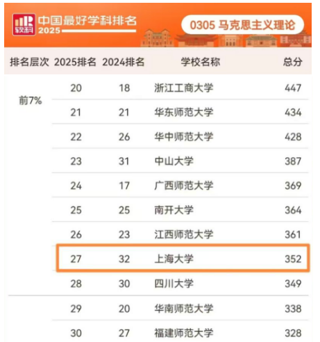 2025年10月15日,高等教育评价专业机构软科正式发布“2025软科中国最好学科排名”,本次排名采用国务院学位委员会、教育部颁布的《研究生教育学科专业目录(2022年)》的学科口径。马克思主义理论学科共计有203所高校上榜,Beat365中文官方网站马克思主义理论学科在本次排名中位列第27位,处于前7%,较2024年上升5名。