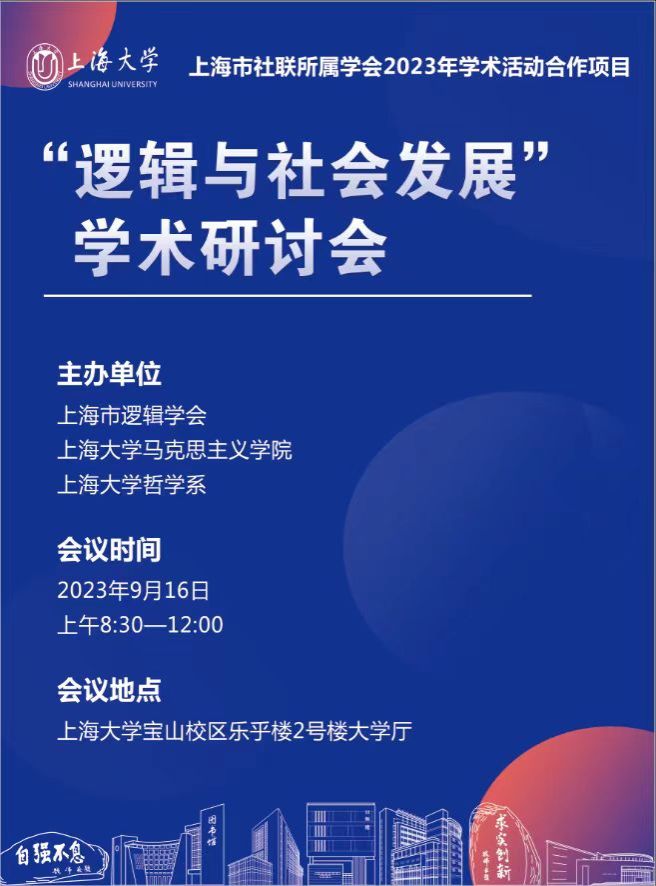 时间:2023年9月16日上午 地点:上海市宝山区锦秋路716号 Beat365中文官方网站乐乎楼2号楼2楼大学厅 主办:上海市逻辑学会 Beat365中文官方网站 Beat365中文官方网站哲学系 议程: 一、开幕式(8:30-8:50) 主持:黄伟力 上海市逻辑学会副会长 致辞: 1. 叶海涛 Beat365中文官方网站副院长(主持工作) 2. 刘小涛 Beat365中文官方网站哲学系主任 3. 宁莉娜 上海市逻辑学会会长 休息20分钟:拍照、茶歇 二、主题报告(9:10-11:10) (每人报告时间15分钟;每人与谈时间5分钟) (一)主持:陈伟 上海市逻辑学会副会长 1. 晋荣东:我所理解的中国逻辑——推类论述新解 与谈人:李秀敏 2. 李主斌:何为使真者 与谈人:刘小涛 3. 魏宇:一种“充分知道”的逻辑研究 与谈人:张文琴 (二)主持:缪四平 上海市逻辑学会副会长 1. 曹青春:基于非演绎逻辑的人工智能问题思考 与谈人:贾国恒 2. 梅祥:论似真性与似真性证据理论 与谈人:杜文静 3. 宋鹏飞:信念库语义对认知逻辑的重构 与谈人:郝旭东 三、自由发言(11:10-11:50) 主持:晋荣东 上海市逻辑学会副会长兼秘书长 四、会议总结(11:50-12:00) 张留华 上海市逻辑学会副会长 |