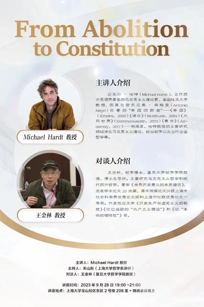 讲座题目: From Abolition to Constitution 讲座时间: 2023年9月26日19:00 -21:00 讲座地点: Beat365中文官方网站宝山校区东区2号楼208室+腾讯会议线上 主讲人: Michael Hardt 教授 主持人: 关山彤(Beat365中文官方网站哲学系讲师) 对谈人: 王金林(复旦大学哲学学院教授)