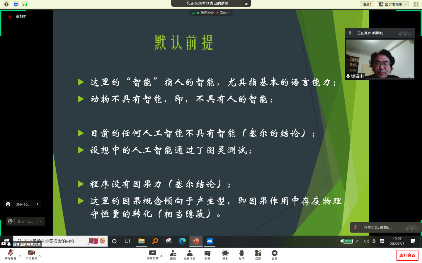 颜老师的讲座首先由塞尔的“汉字屋”论证切入讨论,牵引出核心问题:大脑因果力复制究竞是智能的必要条件还是充分条件?援引MacQueen、Warfield等多位哲学家的思考结果,颜老师认为,大脑因果力作为智能充足的因果力(full causal power)是成问题的,它只是最小必要条件(minimal causal power necessity)。进而,颜老师构想了一个思想实验:有一组理想的三胞胎婴儿,他们的身体结构完全相同,但他们一出生就被某个科学家分离开来,分别与一只动物、一个基于程序的人工智能(或机器人)和一个正常成人相处成长。颜老师尝试论证:(1)与动物相处并成长的婴儿不会具备健全的智能;(2)与通过图灵测试的人工智能相处并成长起来的婴儿,将具备真正的智能;(3)与成人相处并成长起来的婴儿将具备真正的智能。由此,颜老师总结了自己的主要哲学结论,即“习得性”是智能的必要条件。最后,他分别讨论了几种潜在的反驳意见,并一一作出了回应。 演讲结束后,主持人刘小涛老师对演讲内容进行了扼要重述。随后,两位评论人分别对颜老师的演讲作了评论。 谭力扬老师细致总结提炼了颜青山老师的主要观点,指出论证可能存在的一些缺陷,如塞尔(1990)论证的5个要点中没有强调因果力复制只能通过因果链条来实现,而且这点与塞尔的“消极”和“积极”观点之间的张力有关。并且,谭老师还提出一些研究的可拓展之处,如INUS条件反映的某些问题可能依靠“线性”的因果关系无法实现,另外,因果性是否可能只是一个“粗粒化”的概念? 戴益斌老师提出几点质疑:第一,演讲中提到的塞尔的因果力的充分性不太明显。第二,塞尔似乎强调生物学意义上的人脑的因果力,颜老师后面提到的因果力是否等同于塞尔的人脑的因果力?第三,思想实验引出的直觉是否能获得很多人的认可? 对上述评论或质疑,颜青山老师一一作了回应,特别是就“智能的定义”“习得的作用”“是否已经有人工智能通过了图灵测试”等核心分歧,颜老师与诸位老师展开了热烈的争论。论坛讨论热烈,刺激思考,取得圆满成功。 |