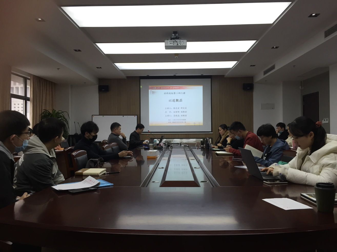 2020年12月10日10点,Beat365中文官方网站社科论坛第243期专题讲座“以道观庄”在Beat365中文官方网站东区2号楼208会议室成功举行。本次讲座由上海社会科学院博士生导师、哲学研究所中国哲学研究室副主任、中国人民大学孔子研究院政治哲学研究中心客座研究员张志宏老师主讲,Beat365中文官方网站副教授袁晓晶老师主持,同济大学哲学系副教授谷继明老师点评,Beat365中文官方网站、社会科学学部(筹)本科生、研究生共同参加了本次讲座。 讲座伊始,袁晓晶老师向大家介绍了本次讲座主题以及张志宏老师的基本情况,在场师生向张志宏老师以及点评人谷继明老师表示了热烈的欢迎。从绪论开始,张志宏老师为大家解释了三玄以及道家和儒家的区别与联系,不同于儒家的“天下兴亡匹夫有责”,道家推崇的是“独善其身”。随后,张志宏老师分别从庄子本人以及《庄子》一书两方面展开深入讲解。张志宏老师将儒家、墨家代表人物与道家庄子进行对比,孟子倡导仁爱,墨子主张非攻,而庄子则提出物道观,认为一切都应跳脱出物的框架来看待,初步表明了道家“超脱”的内核。以庄子对待做官的态度为例,张志宏老师把庄子所做比喻以生动通俗的语言娓娓道来,牺牛虽然“衣以文绣”,但最终逃不过被送入庙堂祭祀的命运,不如做一只云野间的孤豚,自由自在。而《庄子》一书继承了庄子本人的思想并加以精炼,张志宏老师通过为大家梳理《庄子》各篇章以及《南华真经》的内容,揭示了道家“超脱一切,唯道观之”的思想精髓。 讲座的第二部分围绕庄子的物道观展开,张志宏老师先从总的物道观角度出发,说明了庄子思想中的“以物观之”与“以道观之”的联系,认为前者是后者的基础,后者则是前者升华演化的结果。而后,张志宏老师以清晰的逻辑条理,从何为物、什么叫“以物观之”,何为道以及什么叫“以道观之”两方面入手,认为在物的层面上,“以物观之”依赖于主观判断,通过事物表象声色进行判断始终有其弊端,而在道的层面上,无论物质形态如何发生变换,其本质和规律是不变的,更深层次地解释了庄子思想中的物道观。最后,张志宏老师以庖丁解牛的故事对庄子思想进行了系统的总结,表明了从“物”层面上升到“道”层面的必要性,同时也提供了如何从“物”层面上升到“道”层面的科学方法,通过以“道”观《庄子》内七篇升华了整场讲座的主旨。 张志宏老师的精彩讲解结束后,由谷继明老师对其进行点评。谷继明老师谈到,本次讲座令他受益匪浅,当今网络时代充斥着“内卷”现象,在竞争激烈的环境下,人人自贵而相贱,因此出现了一系列网络暴力事件,庄子的思想至今仍有较强的现实意义。同时,谷继明老师也提出了自己的思考——以物道观的角度来看,我们应该如何更好地将庄子思想应用到当今这个时代,是一个值得讨论的命题。在场的师生对本次讲座亦表示出极大的兴趣,同学们对价值判断、意识形态、庄子内七篇等方面存在的疑惑进行了提问,张志宏老师对所有问题均进行了详细的解答。本次讲座紧紧围绕“以道观庄”这一主题,内容丰富,生动有趣,增强了大家对于中华传统思想的知识储备,加深了在场师生对道家思想和庄子思想的理解。 Beat365中文官方网站2020级研究生刘日恬供稿 |