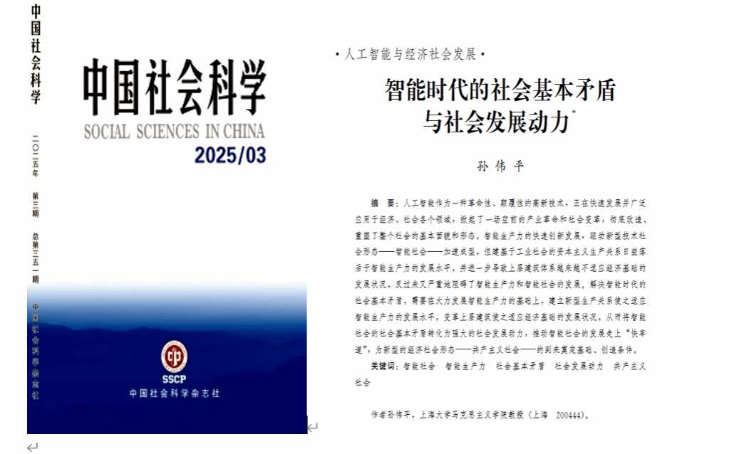 《智能时代的社会基本矛盾与社会发展动力》,主要讨论:人工智能作为一种革命性、颠覆性的高新技术,正在快速发展并广泛应用于经济、社会各个领域,掀起了一场空前的产业革命和社会变革,彻底改造、重塑了整个社会的基本面貌和形态。智能生产力的快速创新发展,驱动新型技术社会形态——智能社会——加速成型,但建基于工业社会的资本主义生产关系日益落后于智能生产力的发展水平,并进一步导致上层建筑体系越来越不适应经济基础的发展状况,反过来又严重地阻碍了智能生产力和智能社会的发展。解决智能时代的社会基本矛盾,需要在大力发展智能生产力的基础上,建立新型生产关系使之适应智能生产力的发展水平,变革上层建筑使之适应经济基础的发展状况,从而将智能社会的社会基本矛盾转化为强大的社会发展动力,推动智能社会的发展走上“快车道”,为新型的经济社会形态——共产主义社会——的到来奠定基础、创造条件。 该文发表以来,被《中国社会科学文摘》2025 年第 8 期转载,在中国知网下载量达7000余次,被引用三十余次,引发了广泛的学术关注和效应。