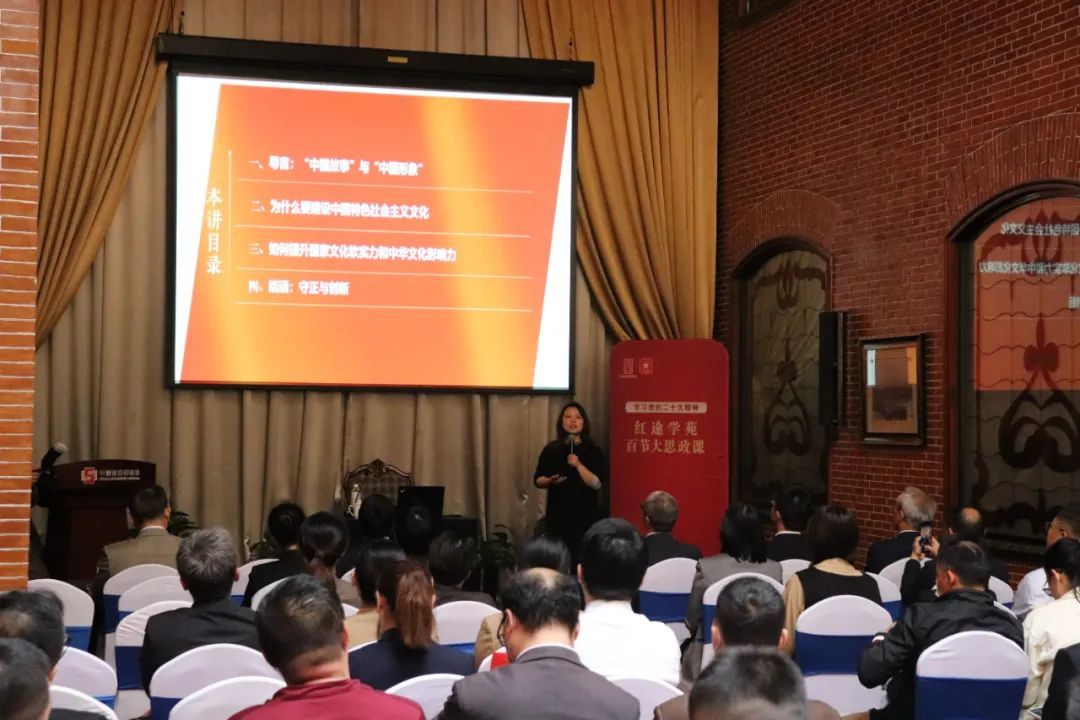 “讲好中国故事”是建立与我国综合国力和国际地位相匹配的国际话语权的重要步骤,是塑造“可信、可爱、可敬的中国形象”的关键环节。袁晓晶副教授以“优秀传统文化的形象载体”为切入点,风趣幽默地引导听众深入理解中华文化与中华形象的相生互促关系,并进一步结合《易经》、天人合一思想等案例,生动展示了优秀传统文化的当代价值,分享了践行中国特色社会主义文化观、学习理解优秀传统文化、传播正能量的方法论与具体举措。“党的二十大报告提到,文化自信是一个国家最基本、最深沉、最持久的力量。”袁晓晶副教授表示,优秀中华文化的传承创新与中国故事的传播,关系到中国在未来国际大变局的时代背景下,能不能维系民族内在的自信之源,能不能在国际交往中展现现代中华风貌、挺立于民族之林。“中华文明源远流长,没有春秋以来的百家争鸣、碰撞、融合和传承就没有今天的中国,因为文化内核是文明发展的前提和基础。今天讲文化自信和文化建设有特殊意义。”袁晓晶副教授表示,大思政课不仅要对大学生讲,也要对更多社会组织、单位讲。红途学苑向广大机关、企事业单位开放报名,扩大了党的二十大精神宣讲覆盖面。“社会各个群体都十分关心中国未来的发展。特别是听完讲座还能通过参观展馆把课程和看到的内容结合起来,这样感受会更加深刻。”