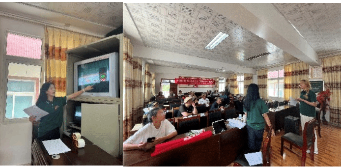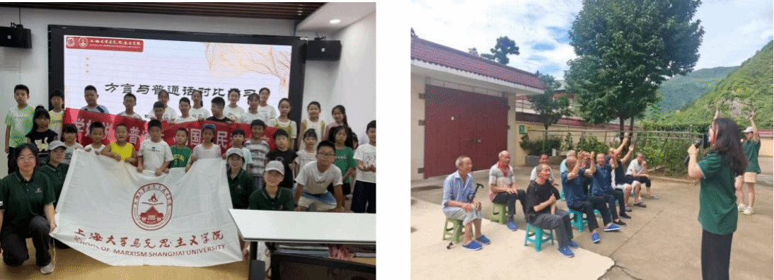在凤凰镇社区服务中心推普助力乡村振兴 7月22日,团队又来到社区活动中心,面向老年群体开设“银龄普通话小课堂”。考虑到老年人的特点和需求,教学更侧重于生活常用语、简单问候语以及重要信息的识别与表达(如名字、住址、求助电话等),耐心讲解、反复示范、慢速领读。志愿者们还编制了图文并茂的简易手册分发给老人,方便日常练习。推普活动有效提升了当地语言能力和社区老人的基础沟通技能,增进了不同代际之间的理解与融合。